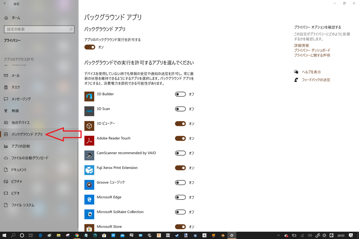 Windows10を使っている方で最近ちょっと動作が重いかも思っている方はバックグラウンドの使用していないアプリをOFFにすると少し軽くなります